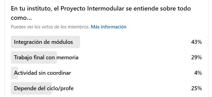 El reto de la Semana 1 consistió en contestar a una encuesta y comentar en las redes sociales del MOOC sobre cómo se entiende el proyecto intermodular en vuestro centro. Aquí os dejamos las respuestas que habéis ido dejando hasta el momento en el grupo de LinkedIn del MOOC: