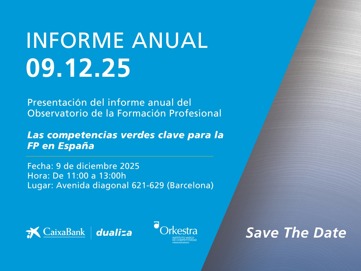 El equipo de investigación de CaixaBank Dualiza, junto a Orkestra-Instituto Vasco de Competitividad, presentan el informe anual de la FP 2025 titulado Las competencias verdes clave para la FP en España a través del que se ha realizado el primer mapeo de las competencias necesarias para que nuestro país afronte la transición verde en nuestro país apoyado en la FP.